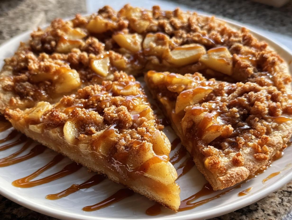 A delicious dessert combining the flavors of apple crisp and pizza, with a sweet apple filling and crumbly oat topping.