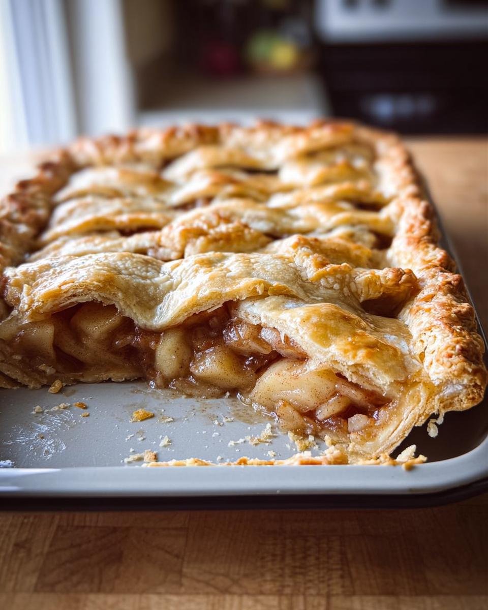 A delicious apple slab pie with a flaky crust and sweet apple filling.