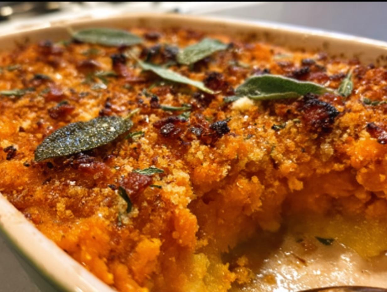 A rich and flavorful sweet potato casserole topped with crispy bacon and browned butter sage.
