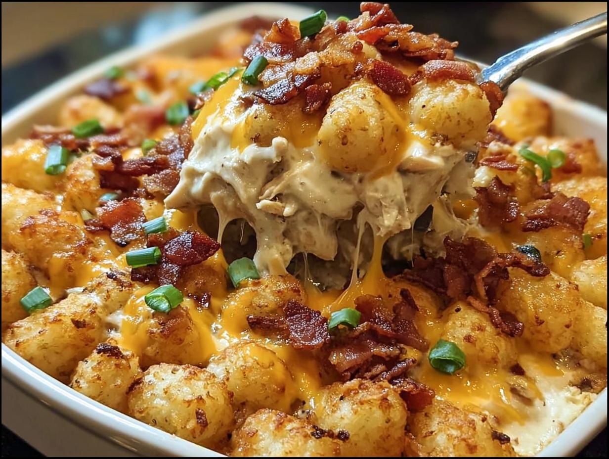 A hearty chicken and bacon casserole featuring a crunchy tater tot base.