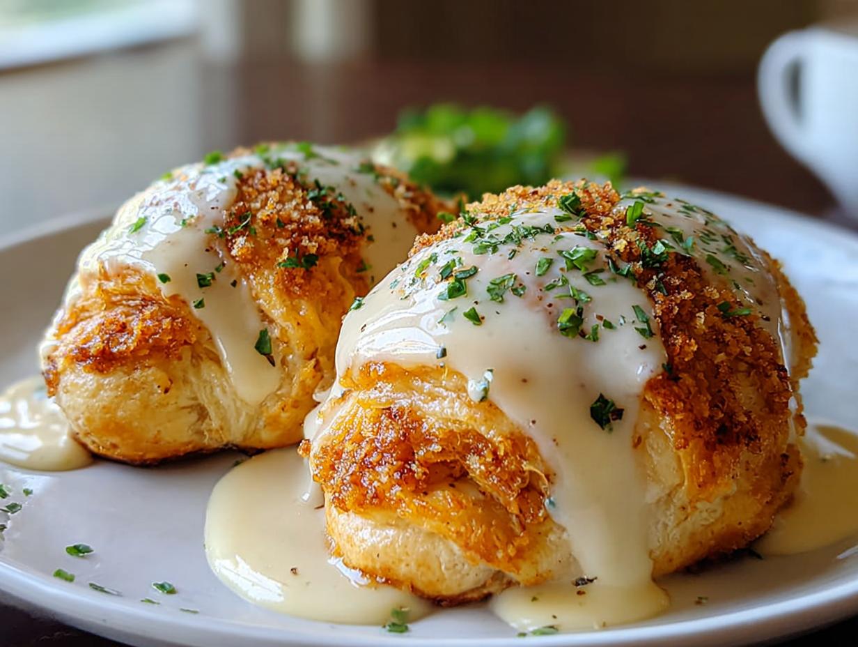 Chicken pillows filled with shredded chicken and cream cheese, baked in crescent rolls and served with a creamy Parmesan sauce.