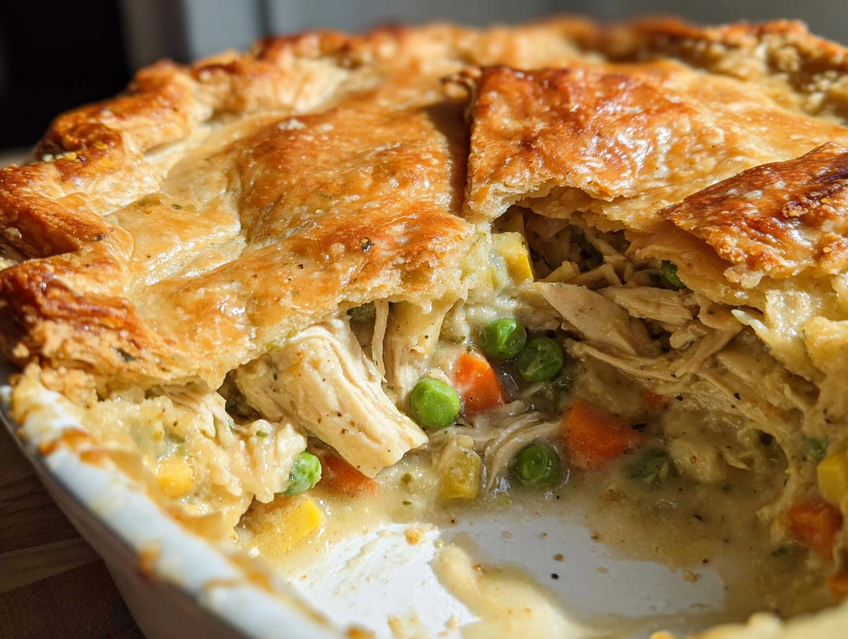 A comforting chicken pot pie filled with tender chicken, vegetables, and a creamy sauce, all encased in a flaky pie crust.