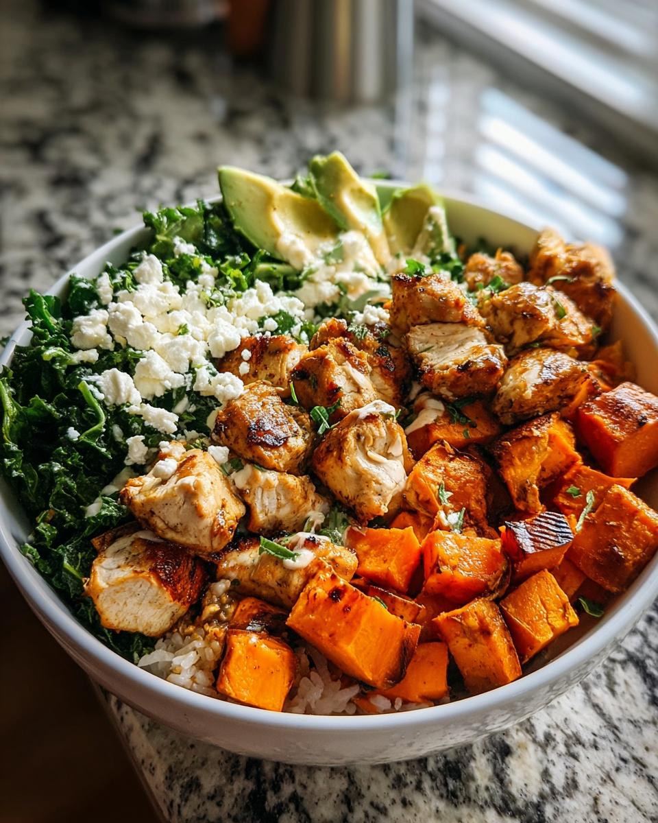 - Assemble bowls with rice, roasted chicken, sweet potatoes, massaged kale, avocado, feta, and drizzle with chipotle sauce.