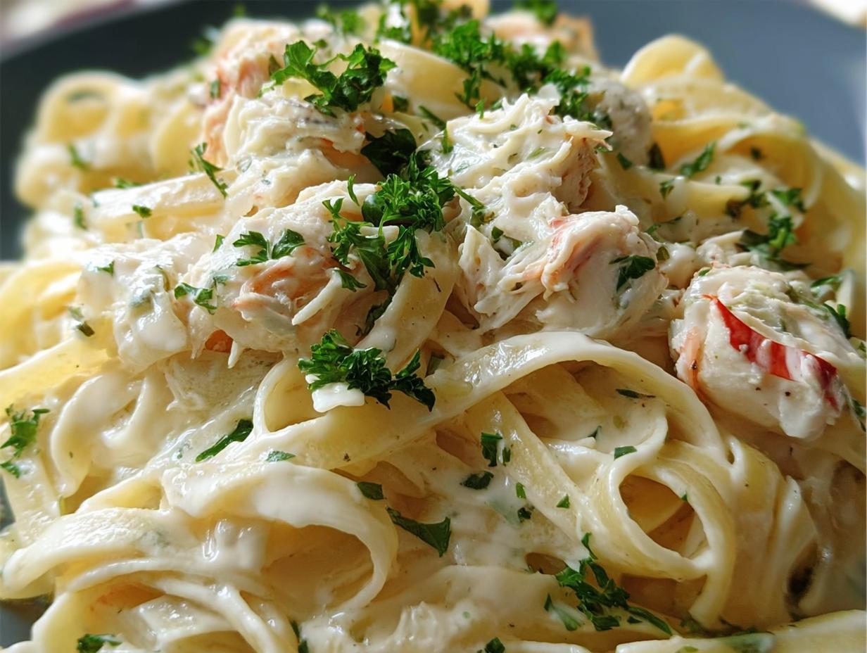 Creamy Crab Fettuccine Alfredo with a rich flavor.