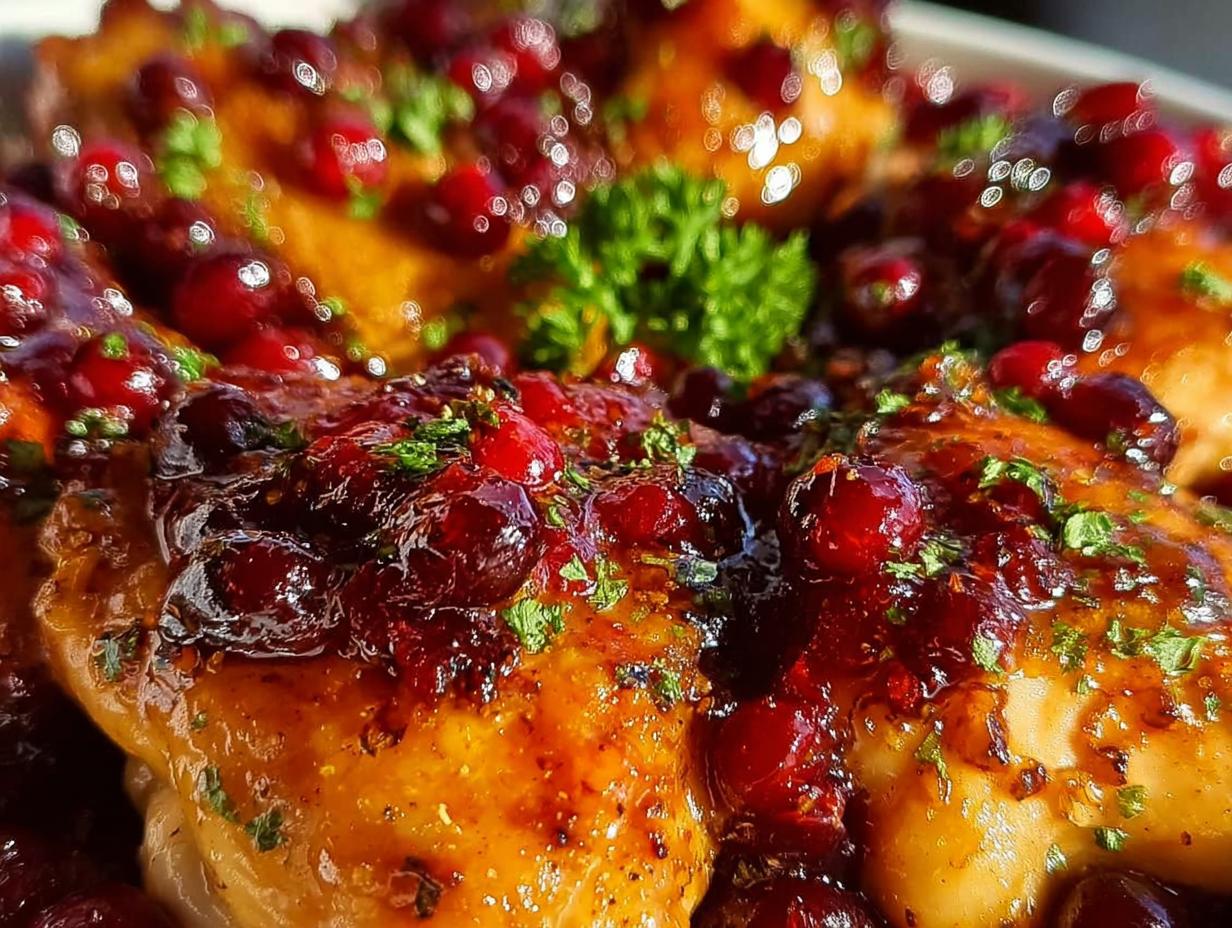 This dish features chicken breasts glazed with a sweet and tangy cranberry orange sauce.