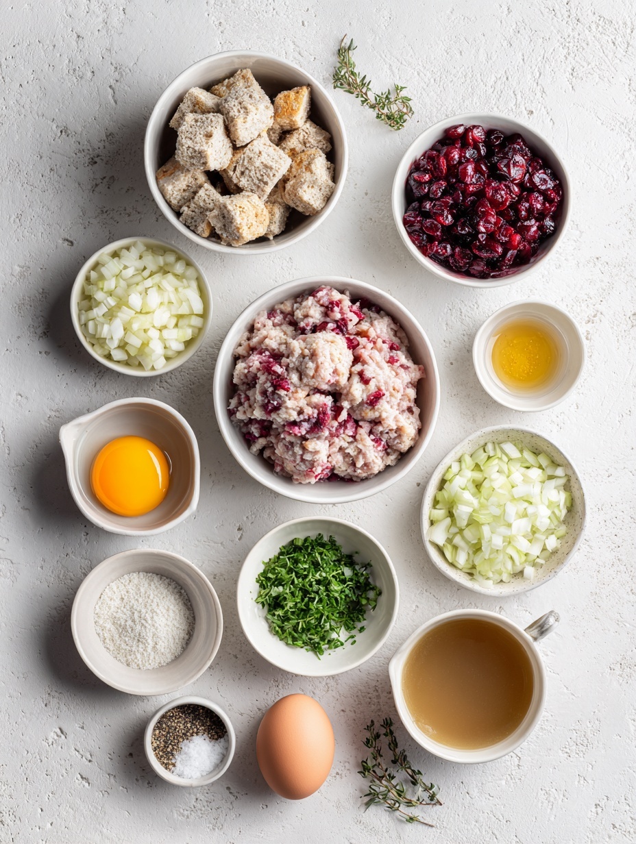 First things first—preheat that oven to 375°F (190°C). While it’s heating up, let’s get everything ready. Chop your cranberries roughly—you want some big pieces for those juicy bursts of flavor. Dice the onion and celery nice and fine (pro tip: do this first so your hands don’t smell like onion when you shape the balls later!). Mince that garlic, beat the eggs, and measure out all your spices. See? We’re already halfway there!