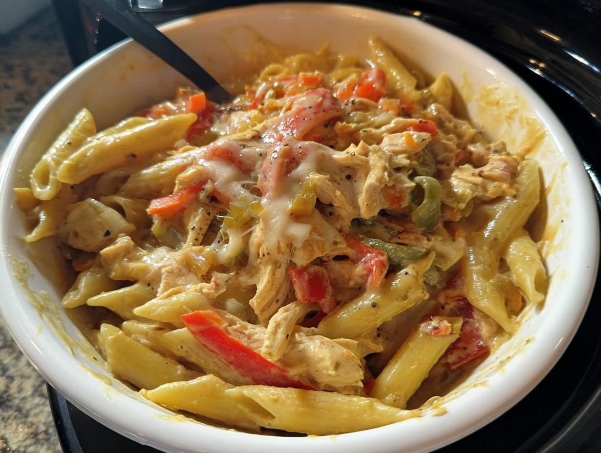 A simple and flavorful crockpot dish combining chicken, peppers, and pasta.