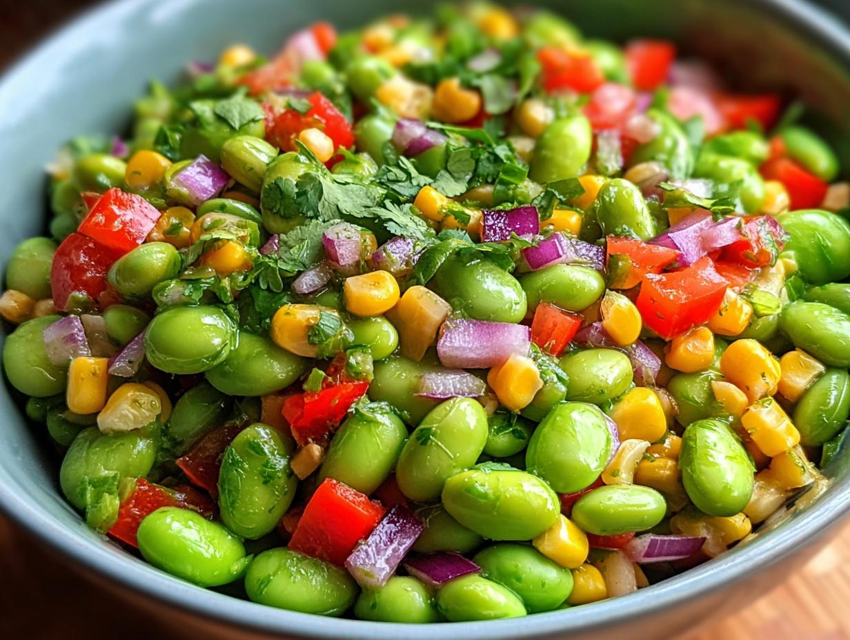- In a large bowl, combine edamame, corn, red bell pepper, red onion, and green onion.