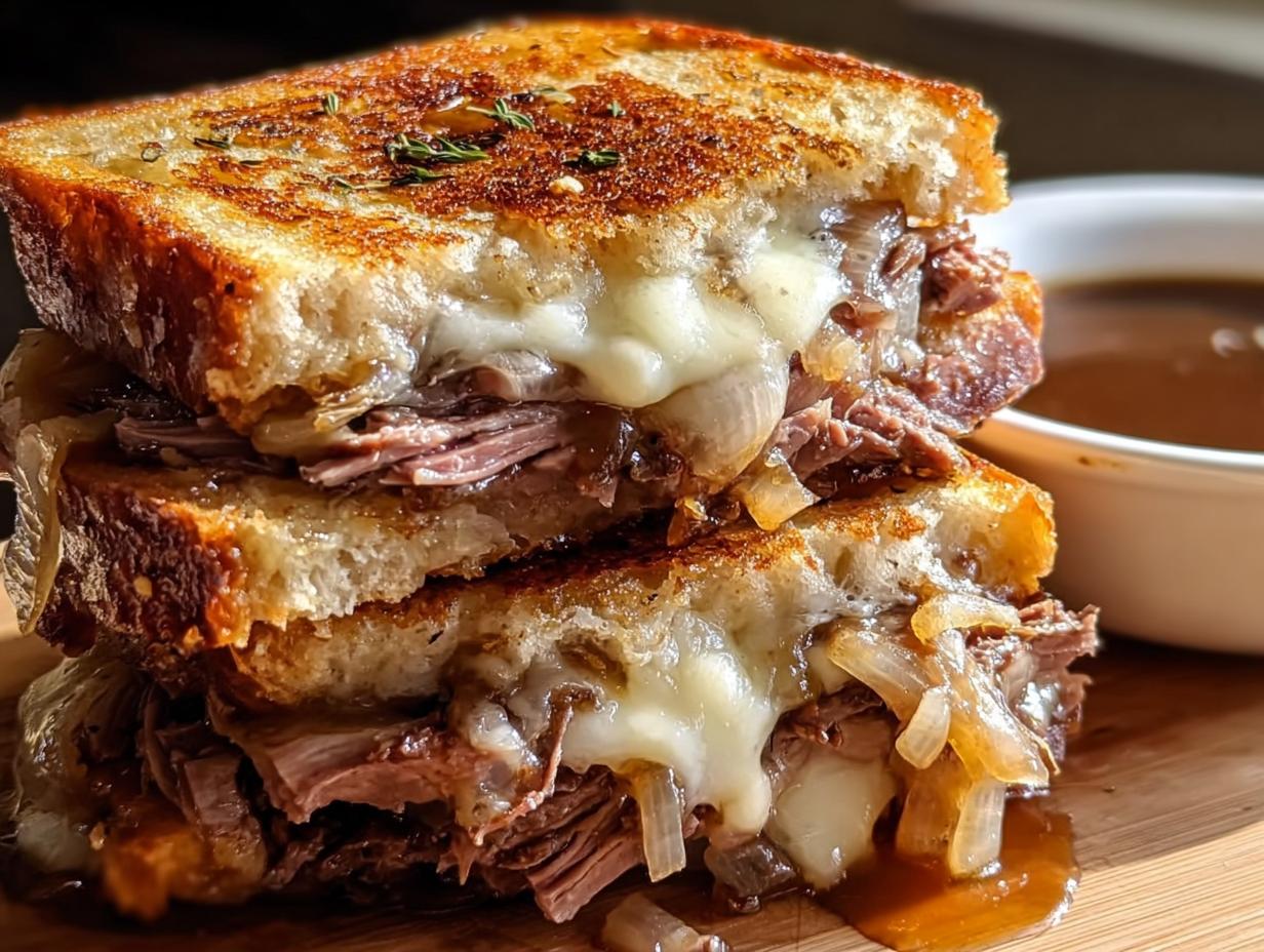 Oh, let me tell you about my absolute favorite comfort food – the French Dip Grilled Cheese! Picture this: a crispy, golden-brown sandwich oozing with melted Swiss cheese and piled high with tender roast beef, all while nestled between two slices of crusty French bread. It’s like a warm hug on a plate! I remember the first time I tried this twist on the classic grilled cheese; I was at a cozy café, and the moment I dipped it into that savory au jus, I was hooked. Now, I whip it up at home whenever I crave something hearty and satisfying, especially on chilly evenings or when I want to impress my friends at a casual get-together. Trust me, this sandwich is not just a meal; it’s an experience!