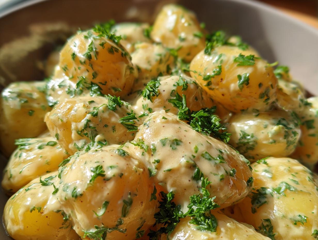 Creamy garlic sauce over baby potatoes.