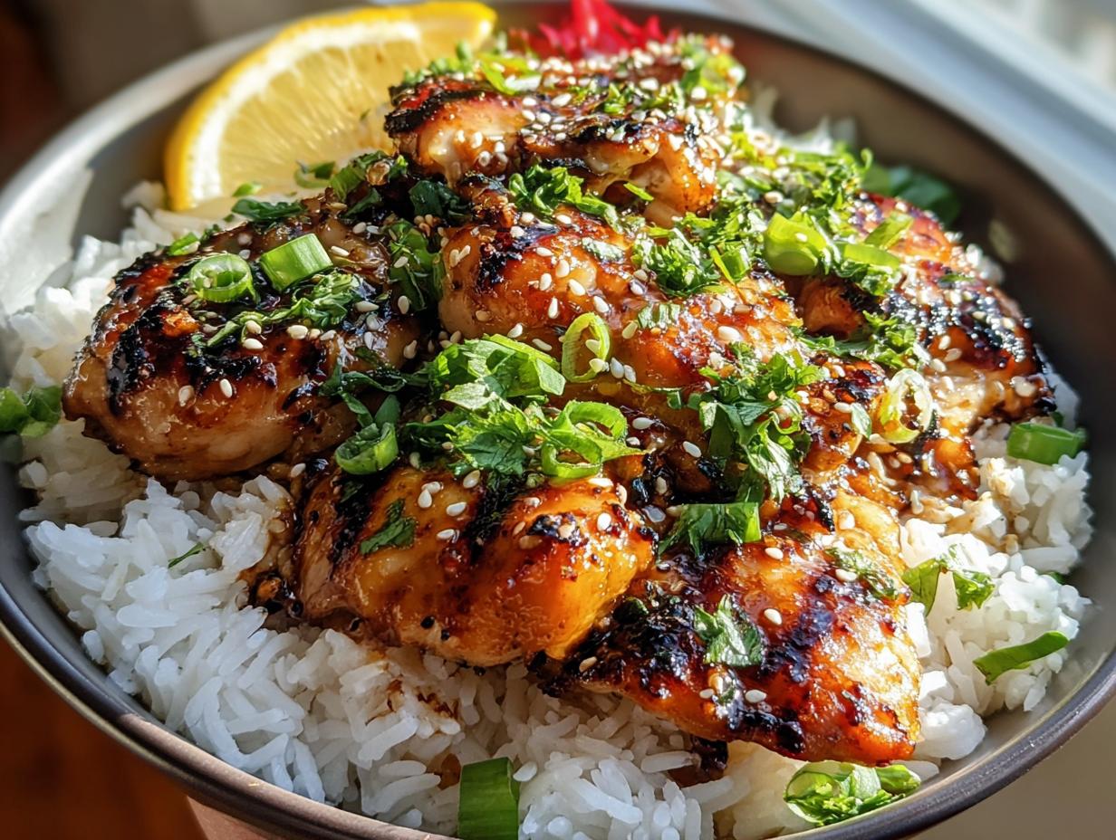 A flavorful Hawaiian dish featuring marinated chicken and creamy coconut rice.