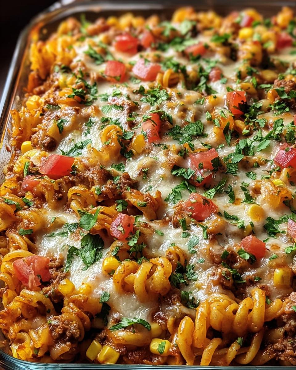 This Loaded Taco Pasta Bake combines pasta with a savory taco-inspired filling.