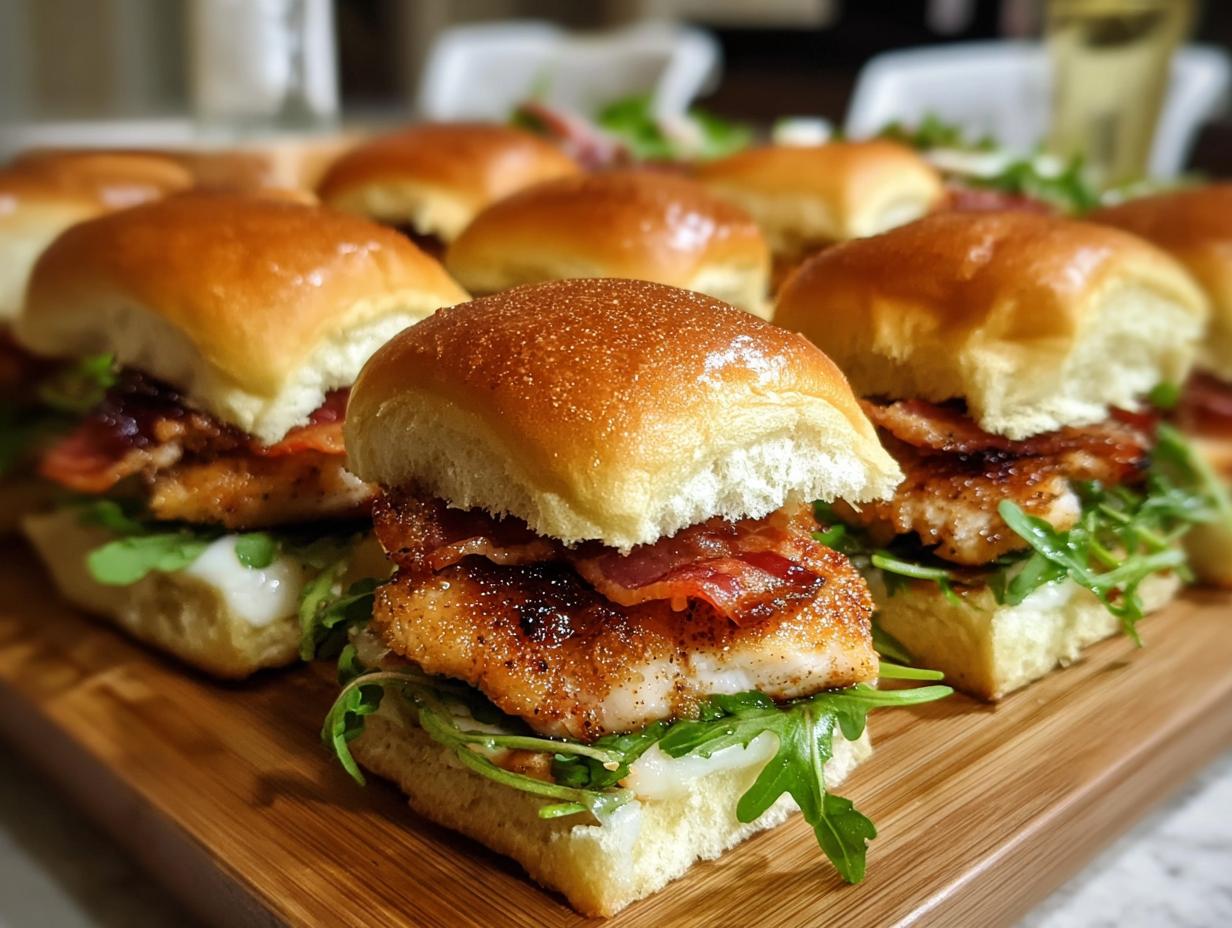 - Assemble sliders by placing chicken on buns, topping with bacon, brie, and greens.