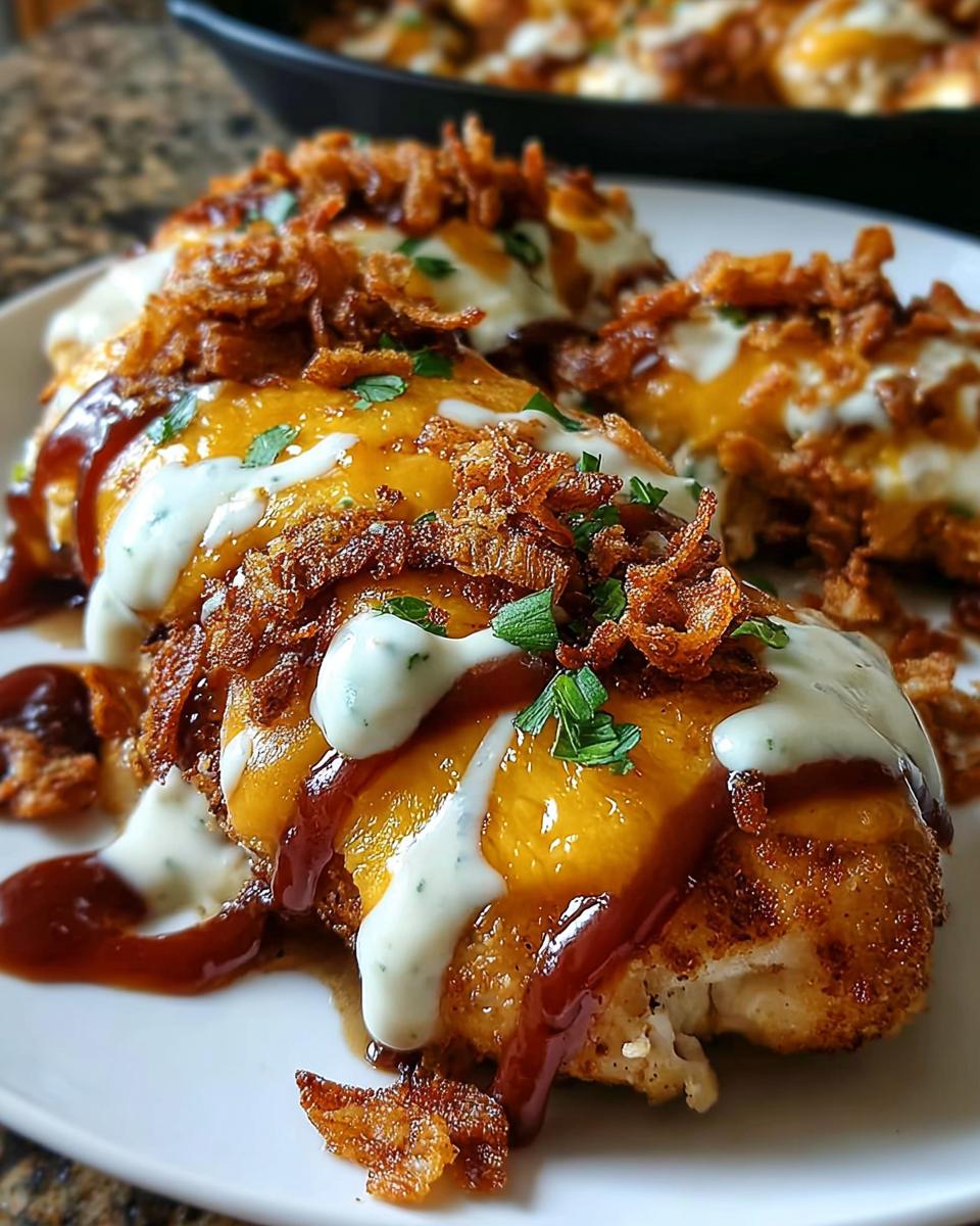 Now, it’s time to bring on the flavor! Start by spreading the ranch dressing generously over each chicken breast. Make sure they’re well-coated for that creamy goodness. Next, sprinkle the shredded cheddar cheese evenly on top. Go ahead and pile it on; who doesn’t love a cheesy dish? Finally, drizzle the barbecue sauce over everything. It should look saucy and inviting!