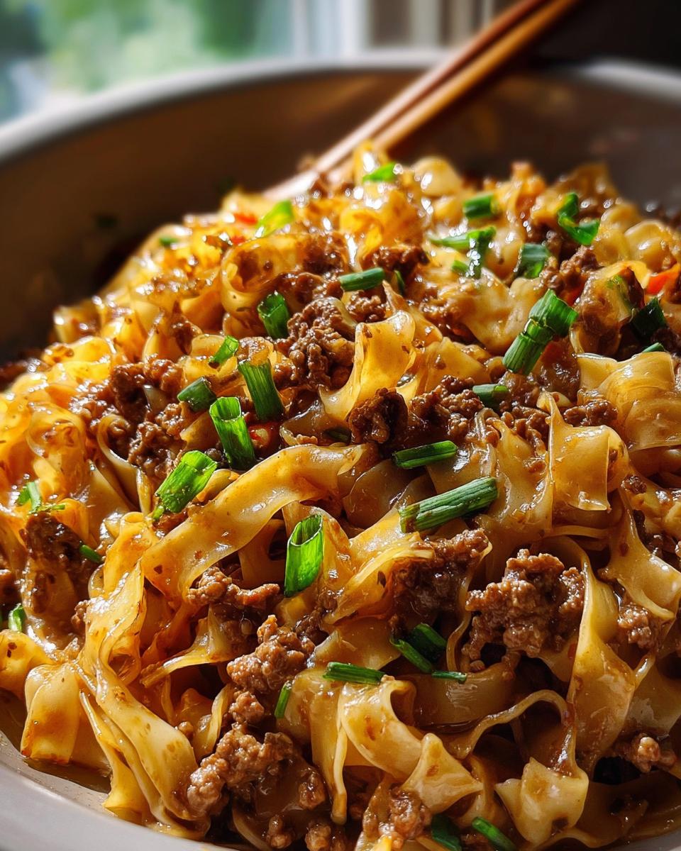 Mongolian Ground Beef Noodles is a savory dish featuring tender beef and wide noodles tossed in a flavorful sauce.