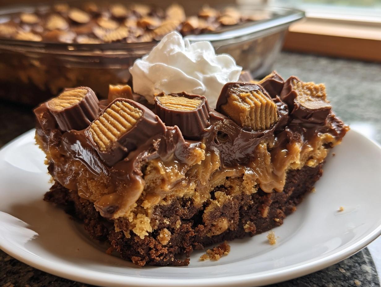 A rich and indulgent dessert combining chocolate cake and peanut butter.