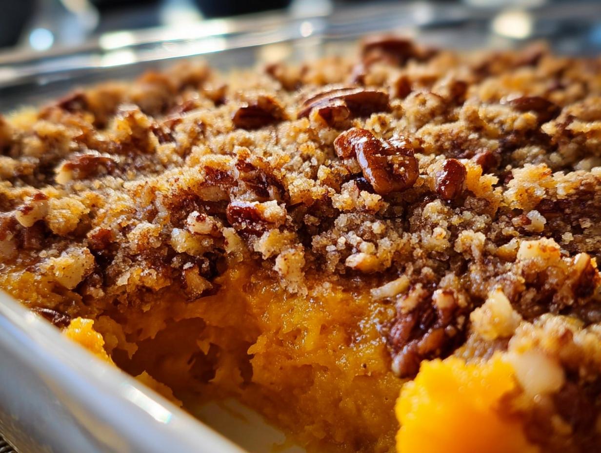 - Sprinkle the pecan mixture over the sweet potato layer.