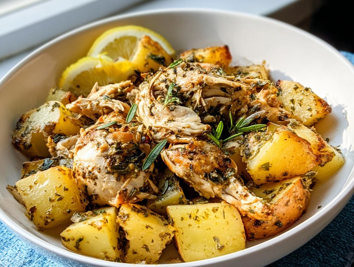 A simple slow cooker chicken recipe with potatoes and lemon.