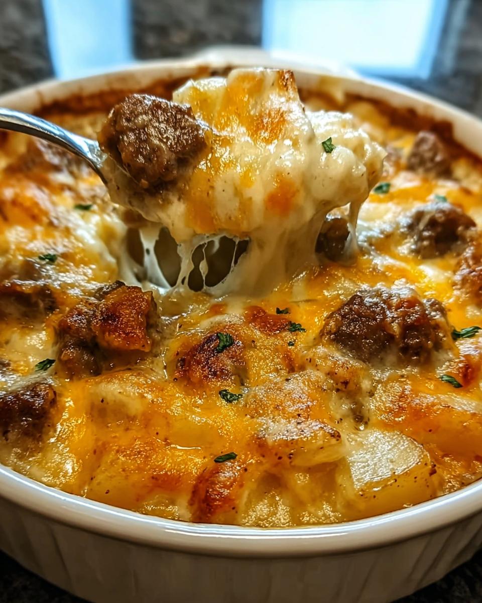 A hearty and cheesy slow cooker casserole with tender steak, potatoes, and cheddar cheese.