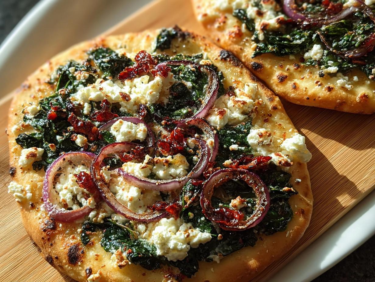 A delicious spinach and feta flatbread pizza that combines fresh ingredients for a flavorful meal.