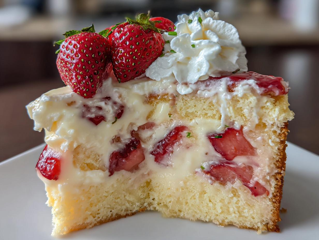 Oh my gosh, let me tell you about my absolute favorite dessert: the Strawberry Custard Delight Cake! This cake is like a sweet hug on a plate, combining a fluffy, soft cake with a creamy custard and juicy, fresh strawberries. Every time I take a bite, I’m transported back to sunny afternoons at my grandma’s house, where we’d sit on the porch, savoring slices of this heavenly treat. It’s become my go-to for gatherings, birthday parties, and even just a cozy weekend treat. Trust me, it’s perfect for any occasion, and the vibrant colors and delightful flavors make it the star of the dessert table!