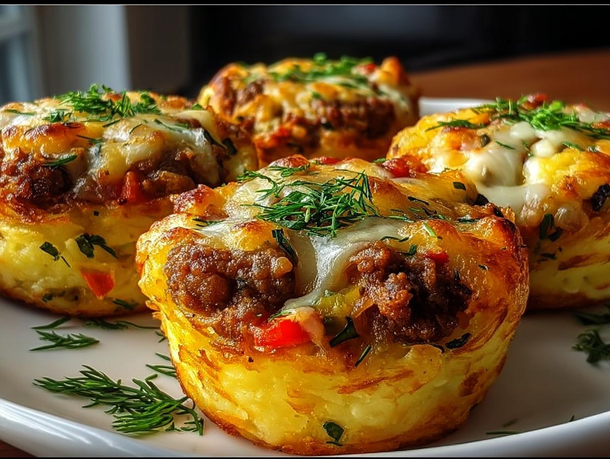 Stuffed Mashed Potato Nests filled with seasoned ground beef, vegetables, and topped with mozzarella cheese.