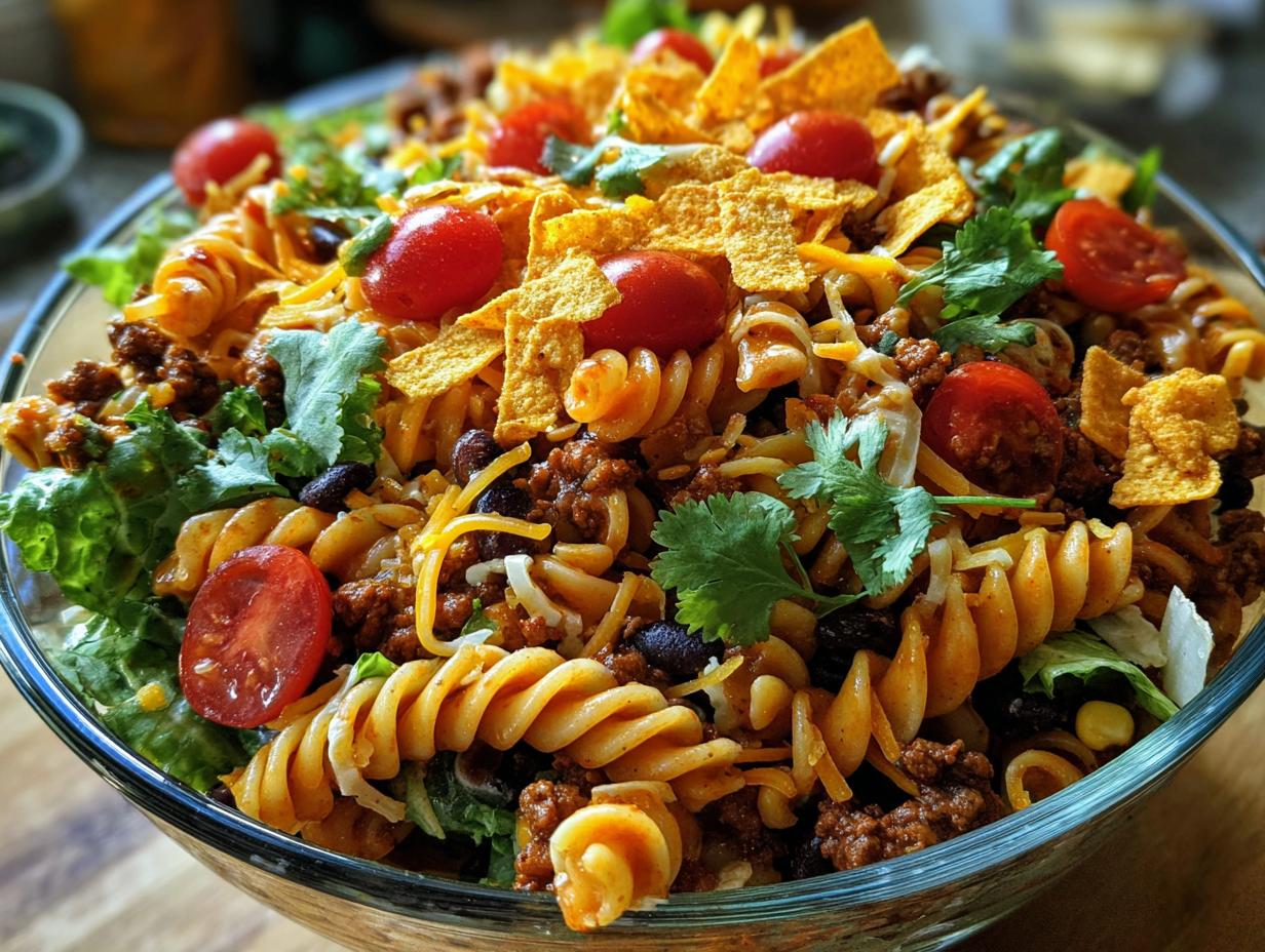 Let me tell you, Taco Pasta Salad is not just any ordinary salad—it’s a flavor explosion that’s sure to please everyone at the table! First off, the combination of seasoned ground beef, fresh veggies, and that delightful crunch from crushed Doritos creates a perfect harmony of textures and tastes. You’ve got creamy, crunchy, savory, and sweet all in one bowl, and trust me, it’s nothing short of heavenly.