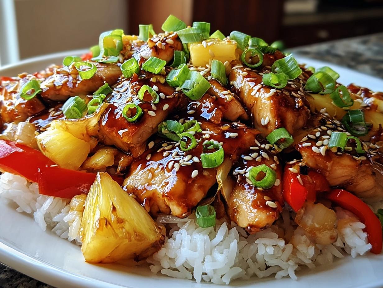 A delicious and colorful dish featuring chicken, pineapple, and vegetables in a savory teriyaki sauce over rice.