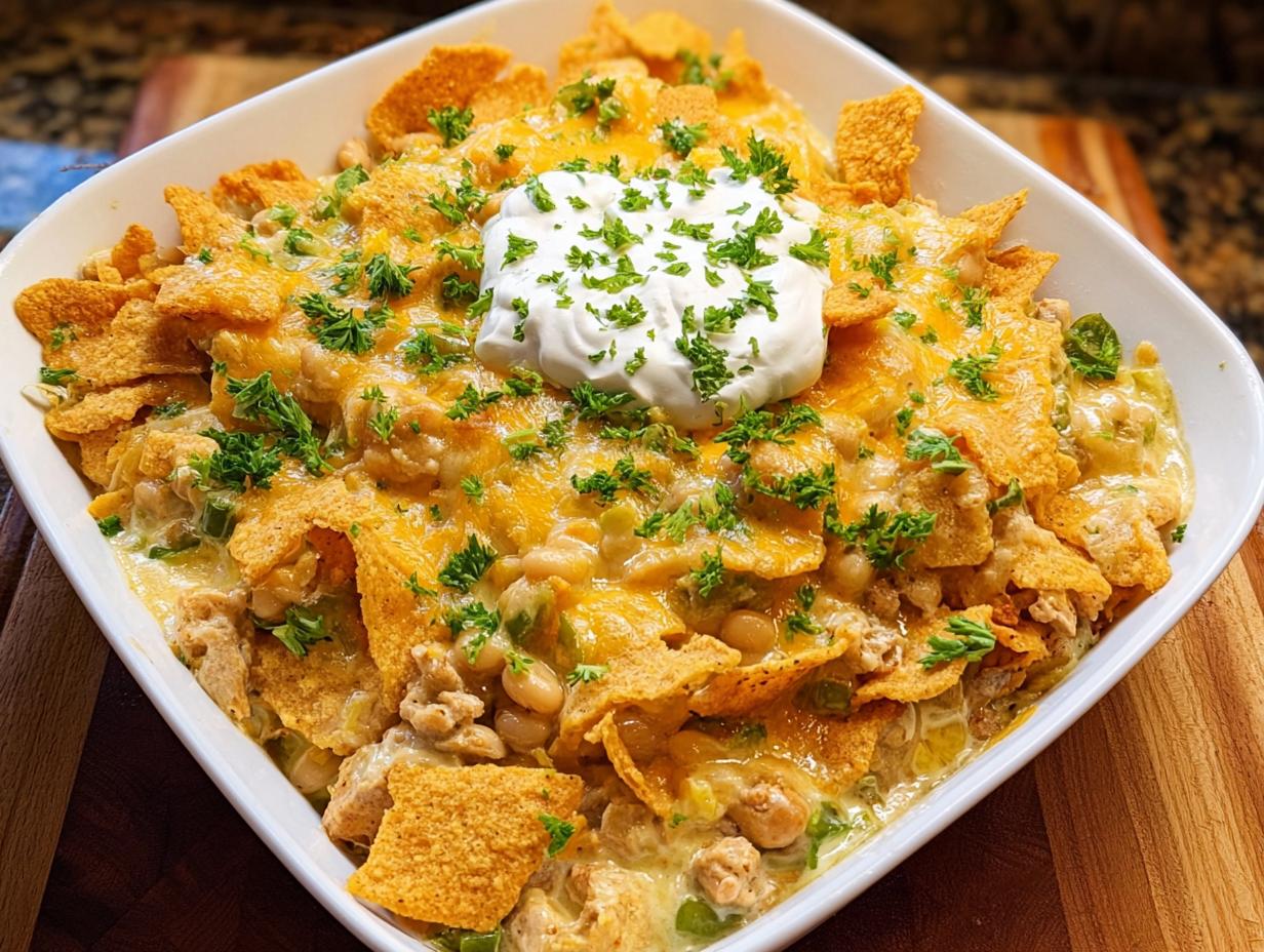 A hearty and flavorful white chili chicken casserole topped with crunchy corn chips and melted cheese.