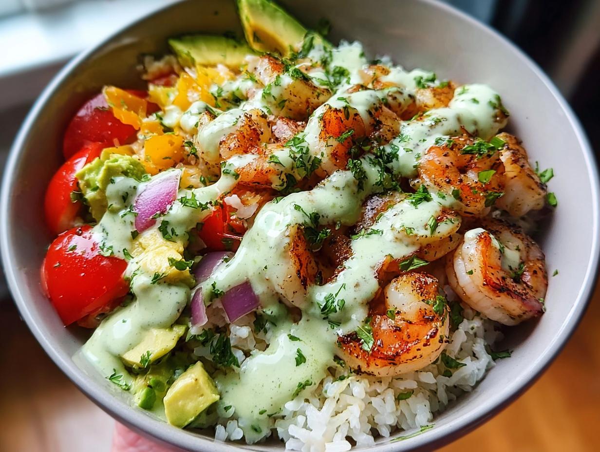 Alright, it’s time to put everything together! Grab your rice mixture and divide it among four bowls. Top each bowl generously with the cooked shrimp, making sure to get all those spices and juices on there! Drizzle on that luscious cilantro lime sauce, and oh boy, it’s looking good! For a final touch, you can sprinkle a little extra cilantro on top or even a wedge of lime for that extra zing. Serve these bowls warm and watch as your family and friends rave about how amazing they are. You’ve just created a feast that’s as gorgeous as it is tasty!
